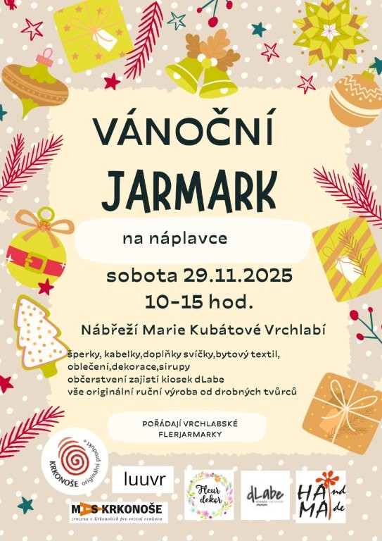 Vrchlabské flerjarmarky pořádají - Vánoční jarmark, který se koná dne 29.11. 2025 na náplavce ve Vrchlabí (Nábřeží Marie Kubátové) od 10 do 15 hodin.